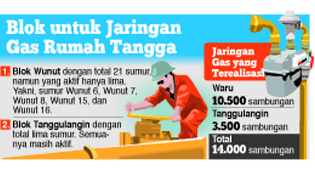 Pada 2005 sebanyak 21 sumur di blok Wunut bisa mengeluarkan gas sekitar 250 juta kubik per hari. Namun, kini sumur-sumur itu hanya bisa memproduksi kurang dari 10 juta kubik.