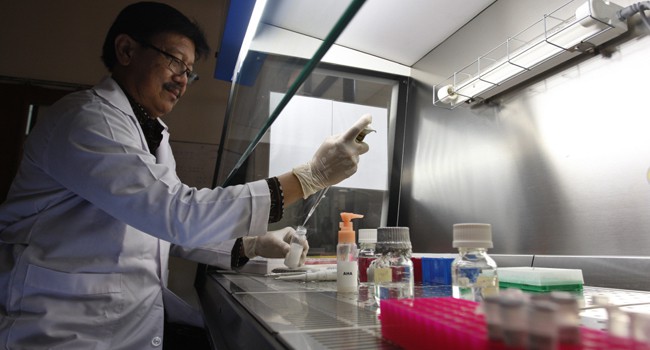 AKTIF MENELITI: Prof Suwarno di ruang kerjanya di lab virologi Departemen Mikrobiologi Fakultas Kedokteran Hewan Kampus C Universitas Airlangga.