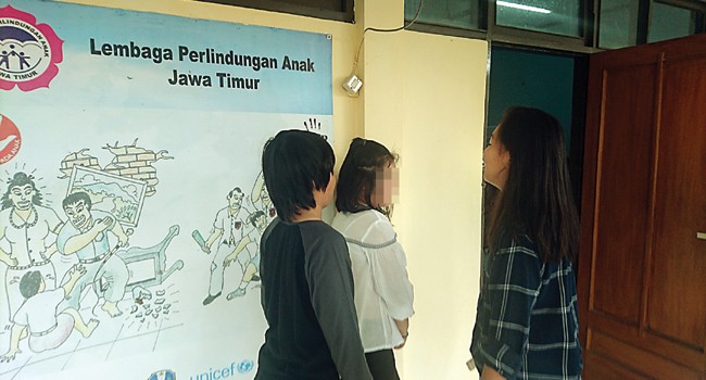 PRIHATIN MAMA: Dari kiri, James, Lawrence, dan Janice mendatangi Kantor LPA Jatim.