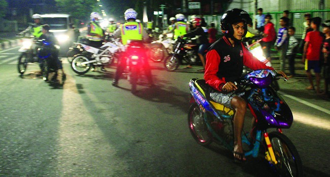 AK ADA AMPUN: Pengendara sepeda motor modifikasi berhamburan ketika personel Delta Speed Satlantas Polresta Sidoarjo membubarkan aksi balap liar di Jalan Jenggolo.