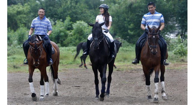 KONEKSI EMOSI: Rucita Permatasari berkuda Kamis (1/12) bersama Bagus Indra Prasetya (kiri) dan Seno Iskandar, pemilik Emporium Horse Club.