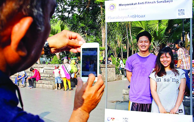 TAK MAU BERITA BOHONG: Ade Triwijaya dan Maria Josephine berfoto dengan properti banner anti-hoax di Taman Bungkul kemarin pagi (8/1). Mereka ikut mendukung budaya literasi bersosial media dengan cara tidak menyebarkan berita-berita bohong. - Image