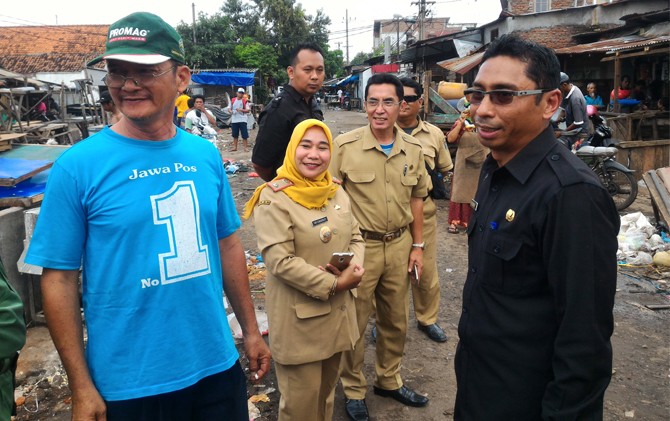 LANCAR: Camat Tambaksari Ridwan Mubarun (kanan), Lurah Pacar Keling Sri Sukarjati, dan Ketua RW Sukahar (kiri) meninjau pembongkaran bangunan liar serta pasar tumpah di Jalan Indrakila.