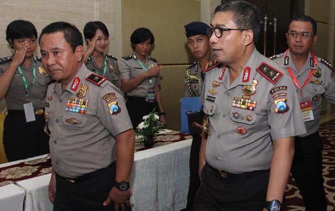 EVALUASI KINERJA: Kapolda Jatim Irjen Pol Machfud Arifin (dua dari kanan) dan Wakapolda Jatim Brigjen Gatot Subroto menghadiri Taklimat Akhir Wasrik Rutin Itwasda Tahap I.