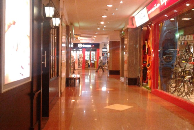 Terpaksa harus naik dan turun eskalator secara manual. Semakin ke atas, hampir seluruh tenant tutup. Hanya dua atau tiga toko yang masih buka. Berbeda dengan mal pada umumnya di mana lantai atas biasanya ada pusat makanan atau food court.