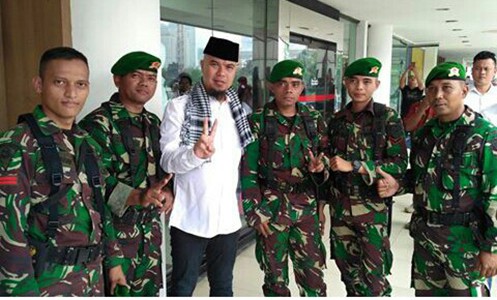 Dalam foto tersebut tampak pentolan Dewa 19 itu berpose dengan sejumlah aparat dari TNI. Memakai busana putih dengan kopiah di kepala, Dhani berdiri berdampingan dengan sejumlah tentara berbusana loreng.