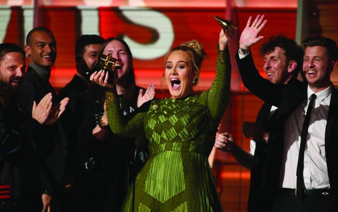 MENANG BANYAK: Adele saat menerima penghargaan Record of the Year untuk tembang Hallo.