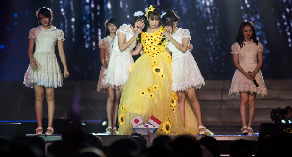 JawaPos.com - Sorakan penonton bergemuruh ketika enam member JKT48 naik ke panggung Trans Luxury Convention Center, Bandung, Sabtu malam (17/12). Haruka Nakagawa yang tampil mewah dengan gaun kuning berhias bunga matahari berjalan paling depan. Dia diikuti Shania, Melody, Kinal, Ayana, dan Veranda yang mengenakan gaun putih. Intro lagu Sungai Impian mengiringi mereka.