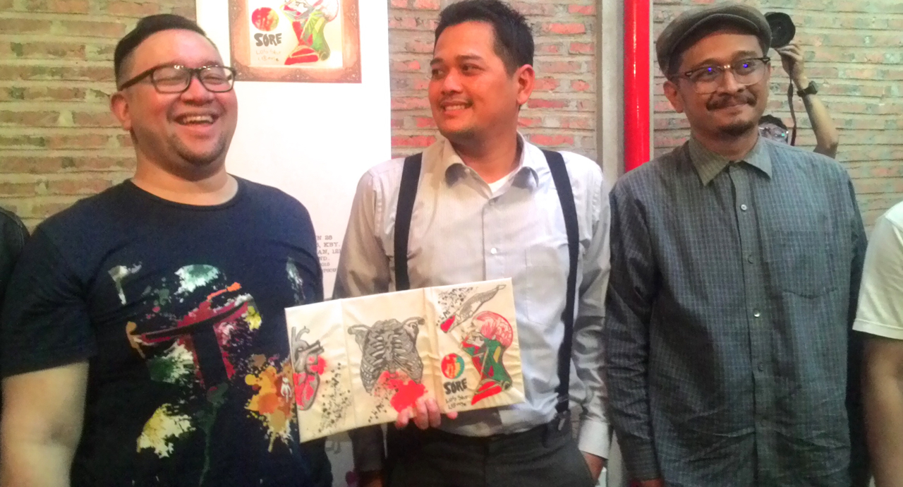 Personel band Sore yakni Bembi, Reza, dan Ade saat launching album Los Skut Leboys.