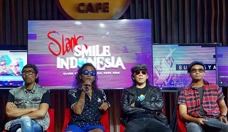 Grup musik Slank, kiri-kanan; Ridho (gitar), Kaka (vokalis), Bimbim (drum) dan Ivanka (bass) saat menghadiri jumpa pers konser
