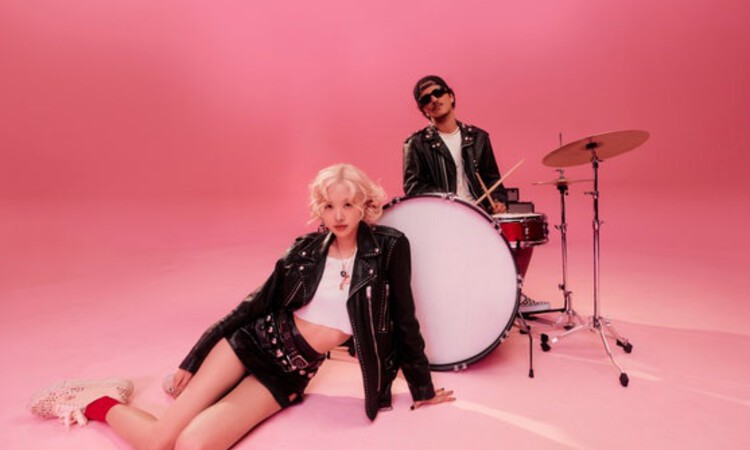 Keduanya mengenakan busana hitam-putih dengan latar depan merah muda cerah, serasi mengenakan jaket kulit dan kaus putih.