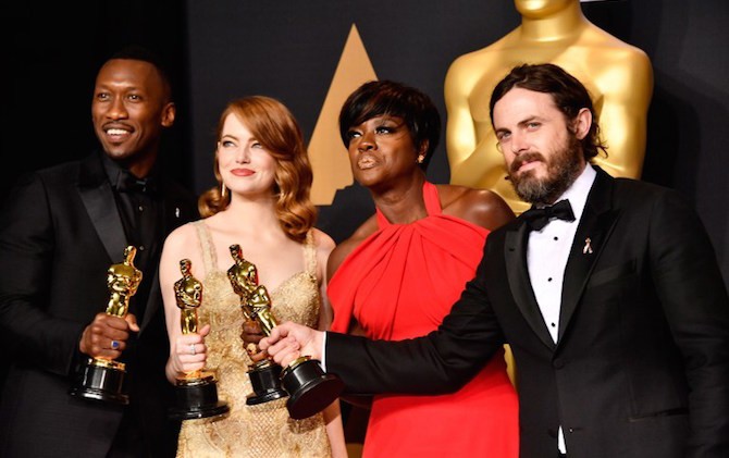 PARA PEMENANG: (dari kiri) Aktor Pendukung Terbaik Mahershala Ali, Aktris Terbaik Emma Stone, Aktris Pendukung Terbaik Viola Davis dan Aktor Terbaik Casey Affleck.