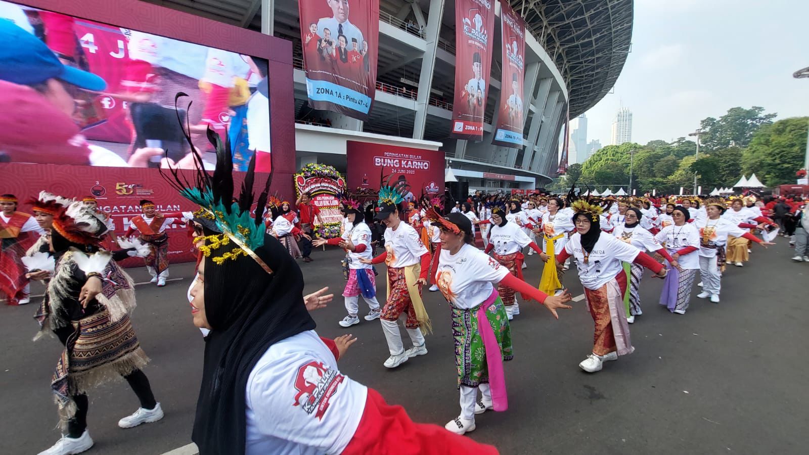 JawaPos.com - Kader dan simpatisan PDI Perjuangan (PDIP) melaksanakan flashmob menyambut puncak peringatan Bulan Bung Karno (BBK) 2023 di Stadion Gelora Bung Karno (GBK), Senayan, Jakarta, Sabtu (24/6). Flashmob itu tampak mengedepankan aspek ke-Nusantara-an. Semisal, gerakan dipimpin oleh pria yang mengenakan pakaian merah khas tokoh pewayangan.