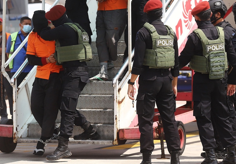 ILUSTRASI. Pasukan Densus 88 Antiteror mengawal 26 teroris yang akan di bawa ke Rutan Mako Brimob Cikeas saat turun dari pesawat di Bandara Soekarno-Hatta, Tangerang, Kamis (04/02/2021).