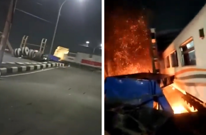 Potongan cuplikan Kereta Api menabrak truk yang berhenti di tengah rel, kemudian tertabrak Kereta sampai terbakar. (RianAlfianto/JawaPos.com).