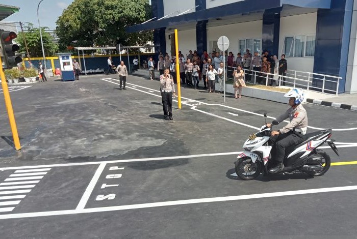 Anggota Kepolisian Resor (Polres) Bantul melakukan uji coba praktik SIM roda dua di satpas polres, Senin (26/6), yang telah diubah dan disesuaikan dengan ujian teori.