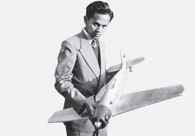 INVENTOR: Rudy Habibie dengan pesawat pertamanya di Koln-kalk, Jerman, Mei 1955. Temuan-temuan Habibie di bidang aeronautika telah memberikan sumbangan besar bagi dunia dirgantara. (Habibie Center)
