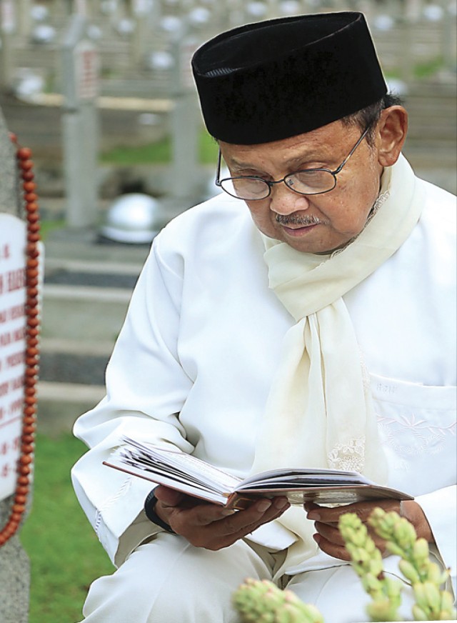 SYAL PELEPAS RINDU: Habibie di dekat pusara Ainun di TMP Kalibata, Jumat (27/5). Selama di Jakarta, Habibie selalu ke makam Ainun tiap Jumat. Dia juga selalu menggunakan syal milik Ainun. (Fedrik Tarigan/Jawa Pos)