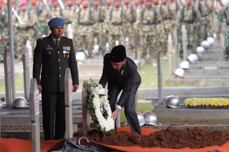 Presiden Jokowi meletakkan karangan bunga pada saat pemakaman B.J. Habibie di TMP Kalibata, Jakarta, Kamis (12/9). (Dery Ridwansah/JawaPos.com)