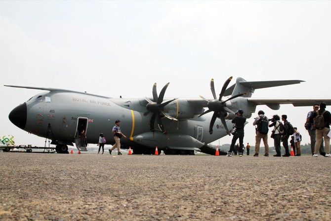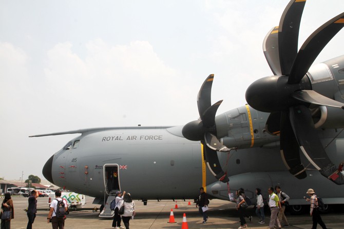 JawaPos.com - Pesawat angkut United Kingdom Royal Air Force A400M mendarat di Bandara Halim Perdana Kusuma kemarin (12/11). Airbus merancang pesawat tersebut untuk tugas militer maupun misi kemanusiaan. Pesawat tersebut juga memiliki kapasitas angkut lebih besar dan daya jelah lebih jauh dari Hercules C-130.