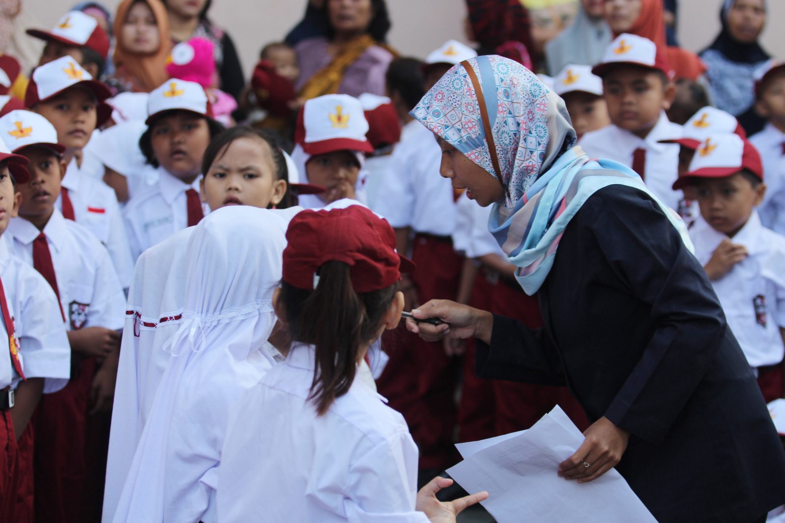 Guru mendampingi siswa pada hari pertama sekolah tahun ajaran baru. (Dery Ridwansah/JawaPos.com)
