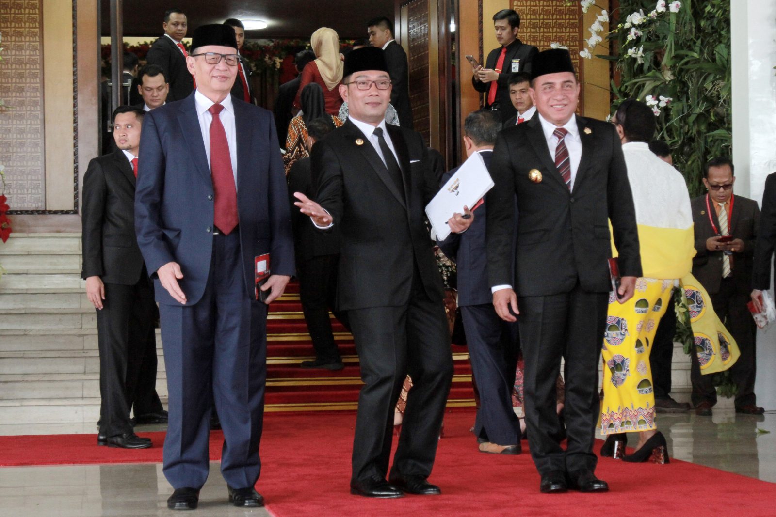 Dari kiri Gubernur Banten Wahidin Halim, Gubernur Jawa Barat Ridwan Kamil dan Gubernur Sumatra Utara Gubernur Sumatera Utara Edy Rahmayadi Karnavian hadir pada upacara pelantikan presiden dan wakil presiden periode 2019-2024 di Gedung Nusantara, kompleks