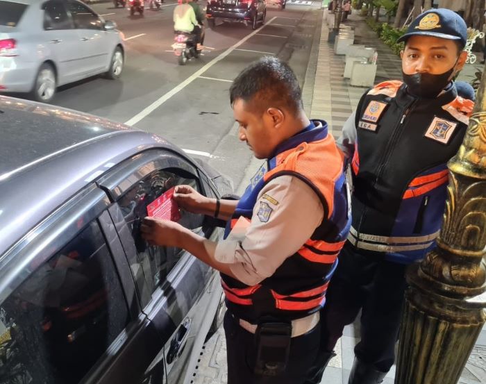 Petugas melakukan tindakan atas pelanggaran larangan parkir tepi jalan di jalan Tunjungan, Kota Surabaya.