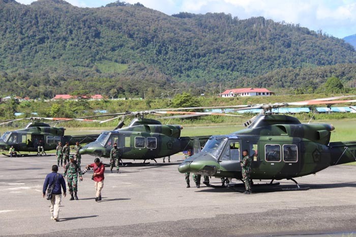 JALANKAN TUGAS: Helikopter yang disiapkan untuk mengevakuasi jenazah korban di Bandara Oksibil kemarin. (ELFIRA/CENDERAWASIH POS)