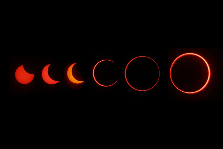 FENOMENA LANGKA: Kolase foto yang menunjukkan proses gerhana matahari cincin. Mulai fase pertama hingga puncak yang dipotret di Desa Bunsur, Kabupaten Siak, Riau, kemarin. (SAID MUFTI/RIAU POS)