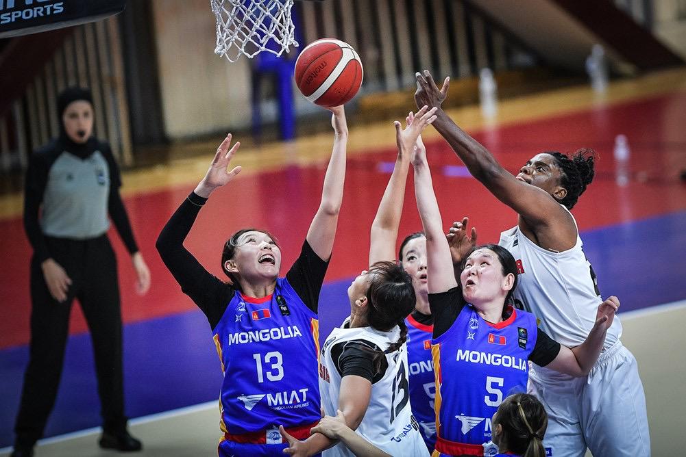 Forward timnas basket putri Kim Pierre-Louis (kanan) berebut bola rebound dengan pemain Mongolia.