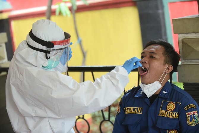 Petugas medis mengambil sampel lendir hidung dan tenggorokan dari para pegawai ASN saat swab test Covid-19 di Kantor Kecamatan Pasar Senen, Jakarta, Senin (15/6/2020). Sebanyak 200 pegawai dari berbagai instansi di Kecamatan Senen menjalani tes swab. Hal