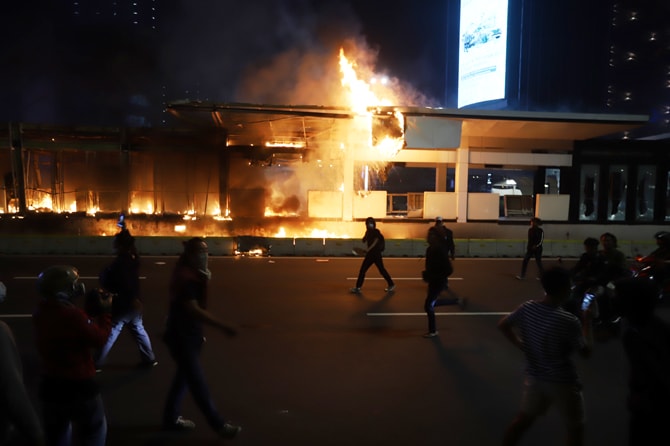 Halte Tranjakarta Tosari dibakar massa saat aksi menolak Omnibus Law UU Cipta Kerja di Kawasan Bundaran HI Jakarta, Kamis (8/10/2020). Massa membakar halte Transjakarta di Jalan MH. Thamrin setelah bentrok dengan petugas kepolisian di kawasan Patung Kuda,