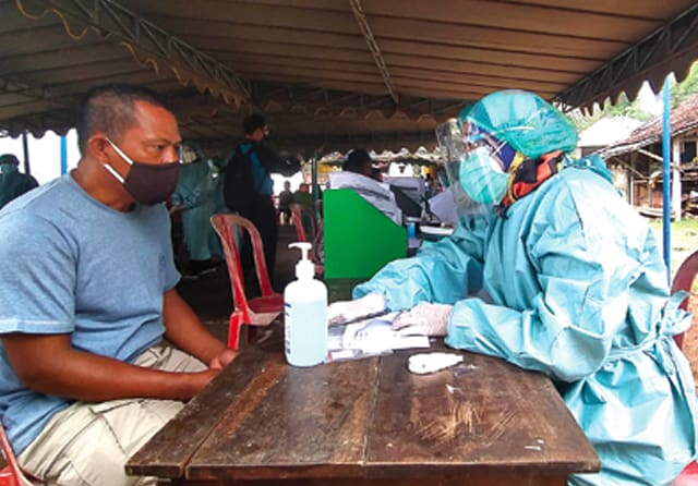 JALANI SWAB TEST: Warga salah satu dusun di Desa Tanjungsari, Pacitan, menjalani swab test setelah enam orang di lingkungan tersebut terkonfirmasi positif Covid-19. (Sugeng Dwi N/Jawa Pos Radar Pacitan)