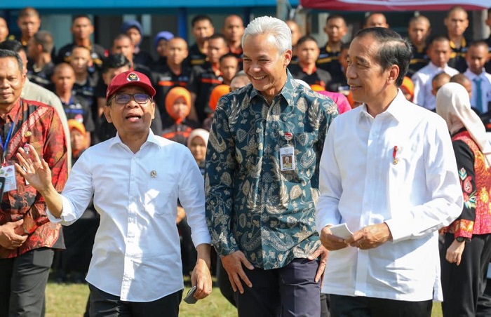Bakal capres yang juga Gubernur Jawa Tengah Ganjar Pranowo bersama Presiden Jokowi saat meninjau SMKN Jawa Tengah, Kota Semarang, Jawa Tengah, Rabu (30/8).