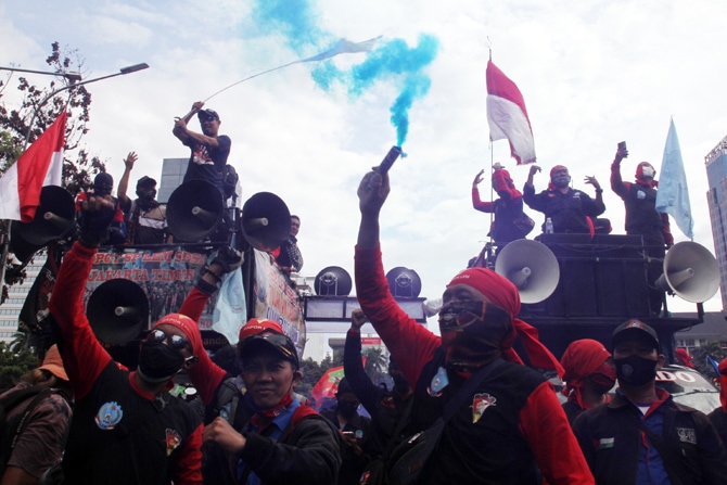 JawaPos.com - Konfederasi Serikat Pekerja Indonesia (KSPI) dan beberapa serikat buruh akan terus melakukan aksi serentak nasional untuk menolak omnibus law UU Cipta Kerja. Berdasarkan informasi yang berkembang bahwa UU Ciptaker akan ditandatangani Presiden dan diberi nomor paling lambat pada 28 Oktober 2020.