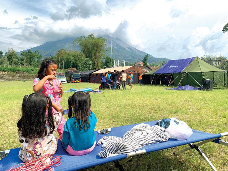 ANTISIPASI MERAPI: Sejumlah bocah bermain di Posko Pengungsian Desa Klakah, Kecamatan Selo, Boyolali, dengan latar belakang Gunung Merapi kemarin (15/11). (ILHAM DWI R/JAWA POS)