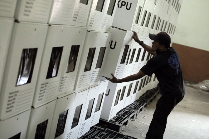 Petugas memeriksa kotak suara yang telah dirakit di Gudang Logistik KPU, Depok, Jawa Barat, Jumat (13/11/2020). Komisi Pemilihan Umum (KPU) Kota Depok telah merakit sebanyak 4.049 kotak suara yang akan digunakan untuk pelaksanaan Pemilihan Kepala Daerah ( - Image