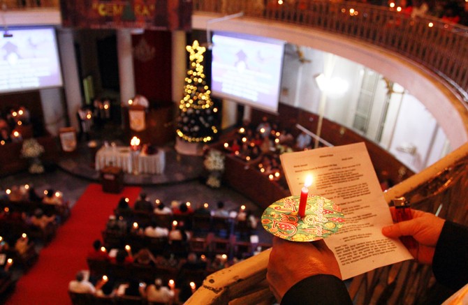 Umat Kristiani menyalakan lilin ketika mengikuti misa malam Natal di Gereja Protestan Indonesia Barat (GPIB) Immanuel, Jakarta, Rabu (24/12/2019). Perayaan Natal yang diikuti umat Kristiani itu mengangkat tema menjaga lingkungan yakni