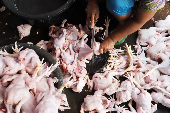 Pekerja membersihkan ayam potong di rumah potong ayam di kawasan Palmerah, Jakarta, Jumat (22/5/2020). Menjelang hari raya Idul Fitri 1141 H dan meningkatnya permintaan ayam di pasaran membuat harga ayam potong naik menjadi Rp30ribu perkilogram yang semul