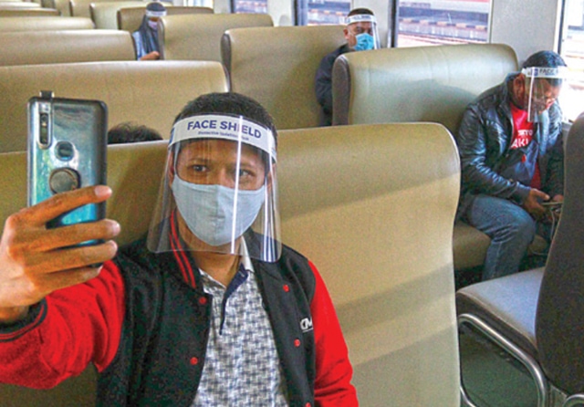 Penumpang kereta api harus menerapkan protokol kesehatan ketat di dalam gerbong. Mulai harus memakai alat pelindung diri (APD) lengkap, menjaga jarak, hingga mencuci tangan dengan menggunakan sabun atau hand sanitizer. (Robertus Risky/Jawa Pos)
