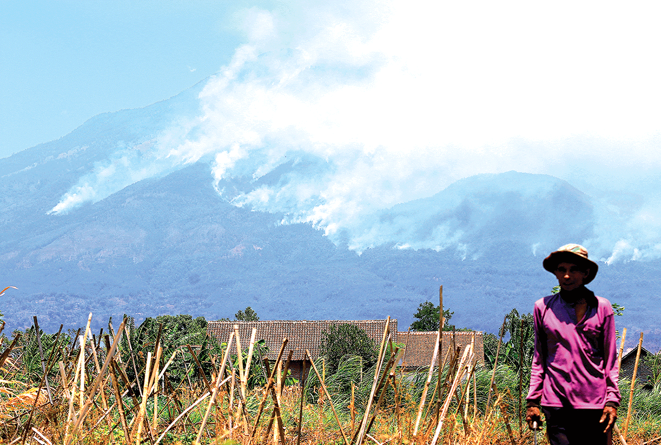 API BELUM PADAM: Kepulan asap akibat karhutla di Gunung Lawu terlihat dari Desa Majasem, Kecamatan Kendal, Kabupaten Ngawi, kemarin (2/10).