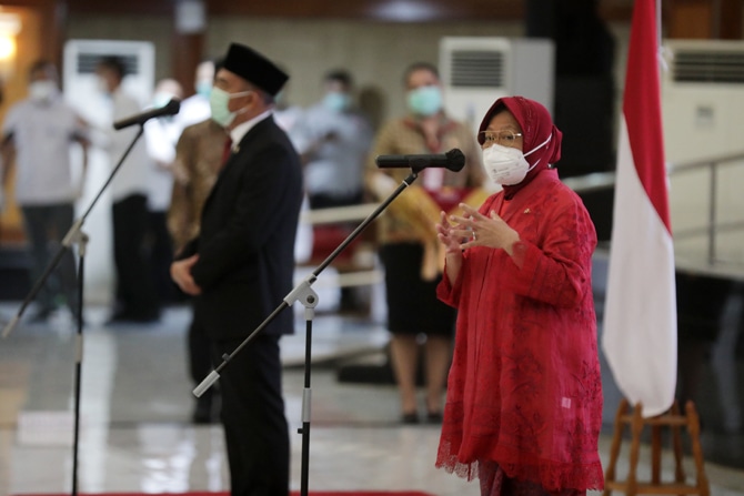 Menteri Sosial Tri Rismaharini saat acara serah terima jabatan Menteri Sosial di Kantor Kementerian Sosial, Jakarta, Rabu (23/12/2020). Tri Rismaharini resmi diangkat Presiden Joko Widodo menjadi Menteri Sosial menggantikan Juliari Batubara yang tersandu