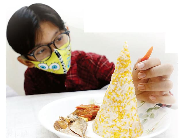 BAHAN ALTERNATIF: Rafi Ayra Wisanggeni, seorang pelajar di Sidoarjo, sedang palting nasi jagung. Jagung salah satu bahan makanan pengganti beras yang banyak diproduksi di Indonesia. (PUGUH SUJATMIKO/JAWA POS)