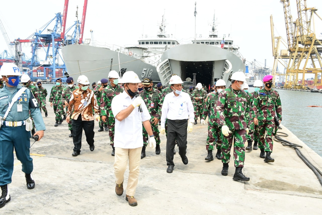 Caption: TAMBAH KEKUATAN. KSAL Laksamana TNI Yudo Margono bersama Panglima Kolinlami Laksamana Muda TNI Iwan Achmadi memeriksa dua kapal perang baru yang akan menambah armada kapal angkut tank TNI AL.