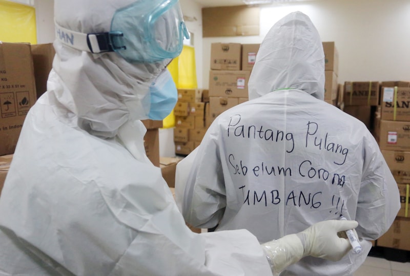 Tenaga kesehatan menuliskan kata penyemangan sebelum bertugas di RS Darurat Covid-19 Wisma Atlet Kemayoran, Jakarta, Selasa (26/1/2021). Kasus positif virus corona (Covid-19) bertambah 13.094 orang pada hari ini, Selasa (26/1). Tambahan itu membuat total