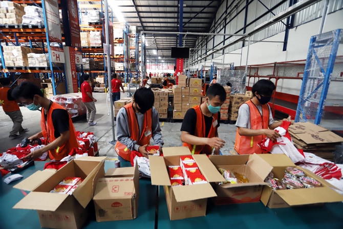 Pekerja saat mengecek ketersediaan stok barang makanan dan minuman di salah satu gudang E-Commerce, Marunda, Jakarta[, Kamis (13/11/2020). Meski sejumlah sektor industri yang lesu selama pandemi Covid-19, Kementerian Perindustrian optimistis industri maka