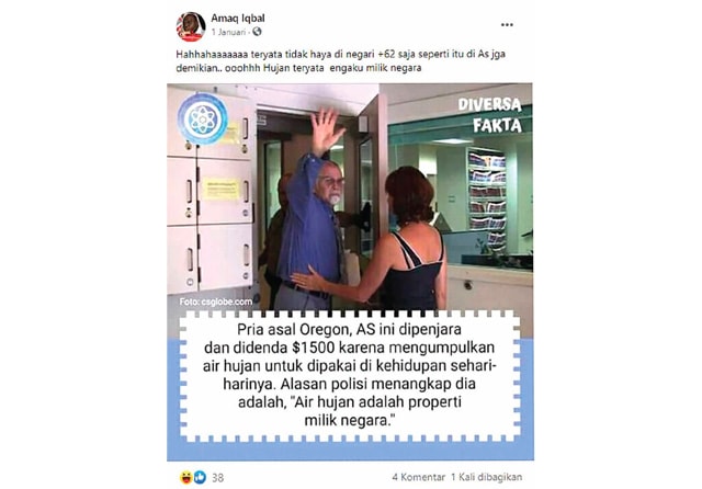 ADA pria di Amerika Serikat yang dipenjara dan didenda USD 1.500 hanya gara-gara menampung air hujan. Alasannya, hujan adalah properti milik negara. Sebuah kabar yang aneh. Meski demikian, banyak netizen Indonesia yang menyebar ulang informasi itu. Bahkan meyakini kebenarannya.