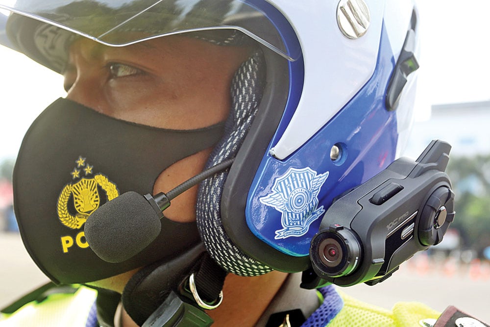 REKAM PELANGGARAN: Anggota Polda Metro Jaya mengenakan helm yang dilengkapi kamera. (SALMAN TOYIBI/JAWA POS)
