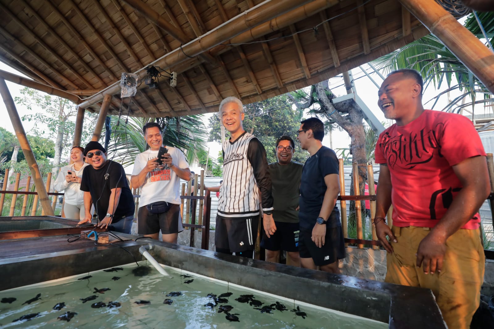 Calon presiden Ganjar Pranowo menunjukkan dukungannya terhadap upaya pelestarian penyu saat mengunjungi konservasi penyu di Pulau Bali.