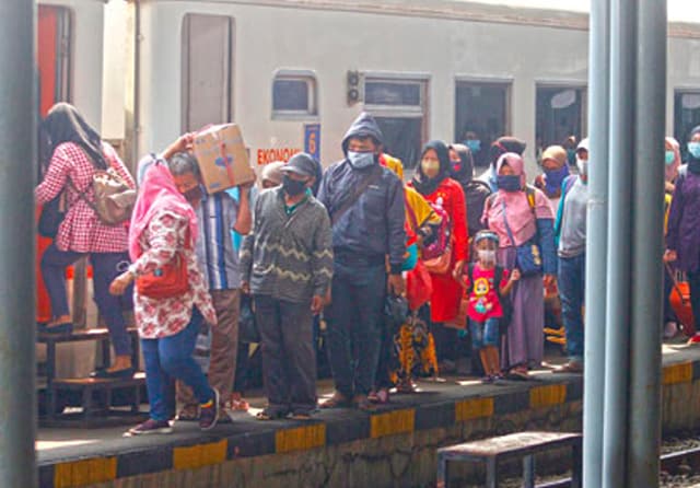 PULANG KAMPUNG: Liburan dimanfaarkan warga Surabaya untuk mengunjungi sanak saudara di berbagai kota dengan naik kereta api. Pengelola Stasiun Pasar Turi tetap meminta para penumpang memakai alat pelindung diri (APD). (Ahmad Khusaini/Jawa Pos)